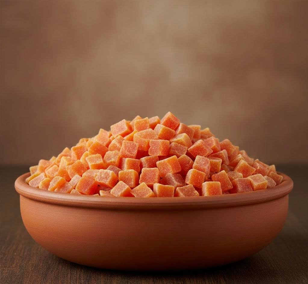 Cuburile de papaya sunt obținute din papaya bine coaptă, tăiată în cuburi și uscată cu grijă, pentru a păstra gustul ușor dulce și aroma exotică. Textura plăcută și aspectul colorat le fac ideale atât pentru gustări, cât și pentru utilizare în diverse preparate.